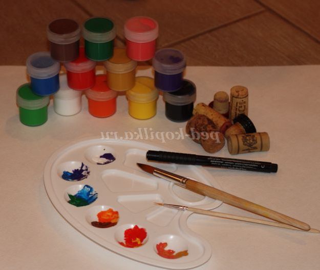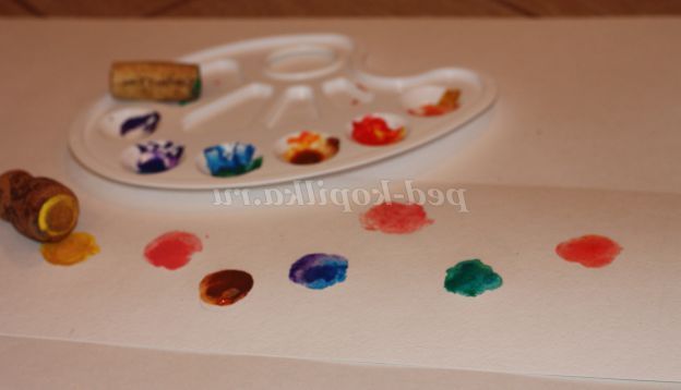 Нам потрібно гуаш або акварель, палітра (для змішування фарб), кисочки (велика для того що б брати фарби і мала для прорисовывания дрібних деталей), щільна папір і, звичайно ж, пробки. Пробок треба кілька штук, що б не мити багато разів
