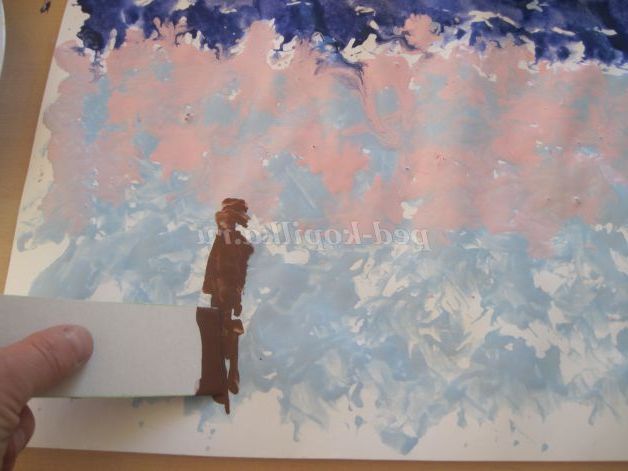 2. Беремо паперовий грудочку і занурюємо його з гуаш синього кольору, малюємо верхню межу неба, промаківая лист.