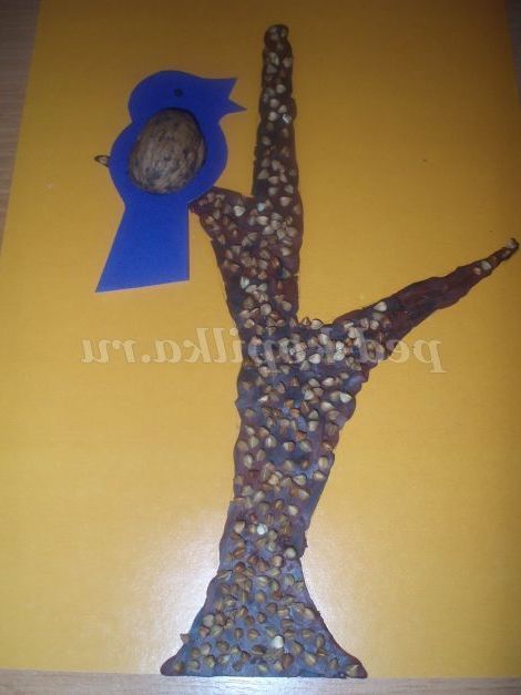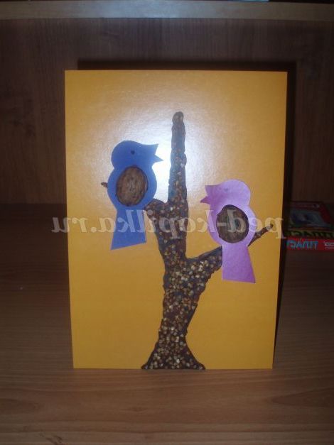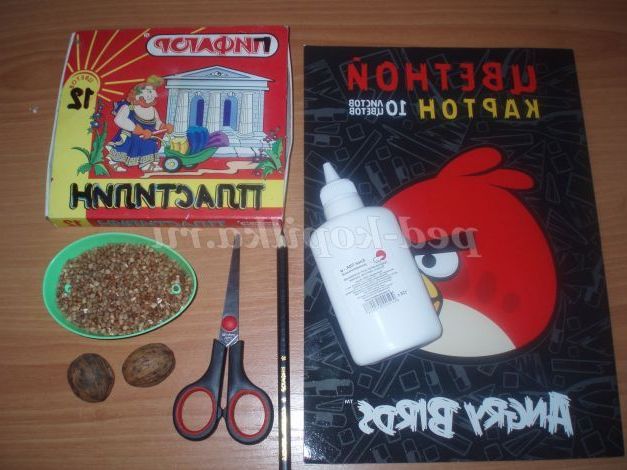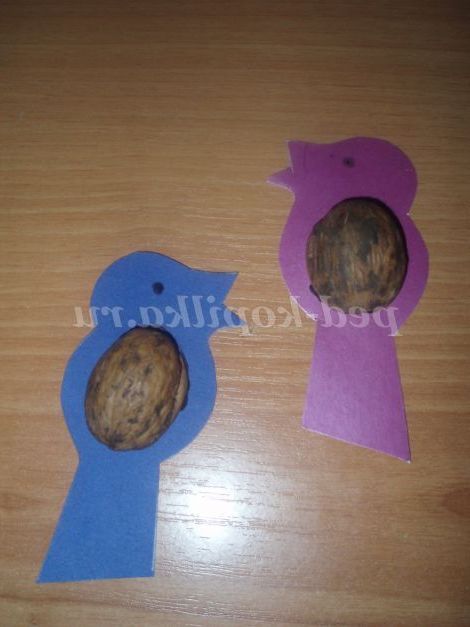 Крок 4. Розгорнувши тоненький джгутик з пластиліну, прикріплює його із зворотного боку шкорлуты волоського горіха, міцно притискає його і кріпить на вже вирізану з кольорового картону пташку.