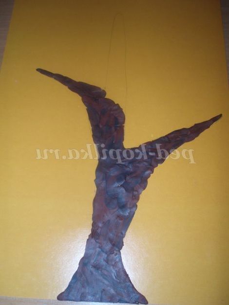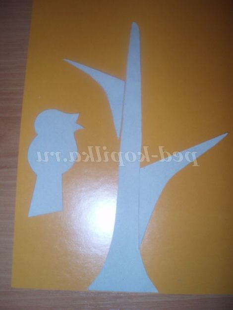 Крок 1. З картону білого кольору вихователь готує шаблони стовбура і гілок дерева, пташок. Потім дитина обводить за шаблоном стовбур, гілки, пташок.