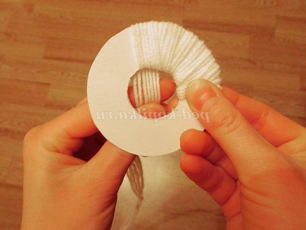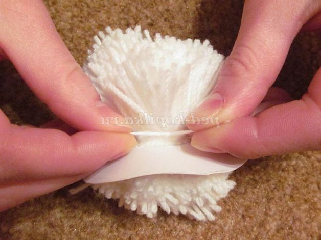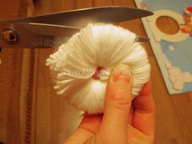 5. Пов'язуємо по середині, витягуємо картон, підрізаємо ножицями зайві стирчать нитки, робимо покруглее наш сніжок.