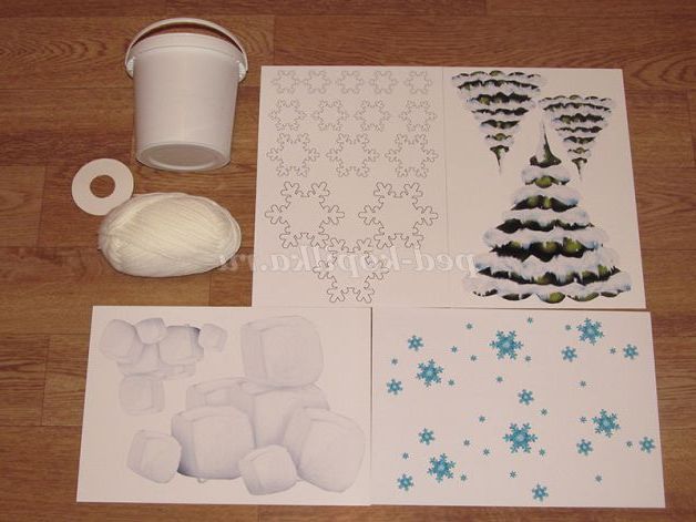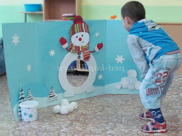 На макет зі сніговиком і на відерце приклеюємо сніжинки. У відро кладемо сніжки, можна приступати до гри. Для дітей постарше можна ускладнити гру, надівши, наприклад, рукавиці на руки і провести гру у формі змагання. Для різних команд сніжки різного кольору. Або можна зробити мітки з окулярами на підлозі скотчем, за які не можна заступати, якщо дитина потрапляє з цієї позначки, то йому плюсується стільки очок, скільки було на мітці.