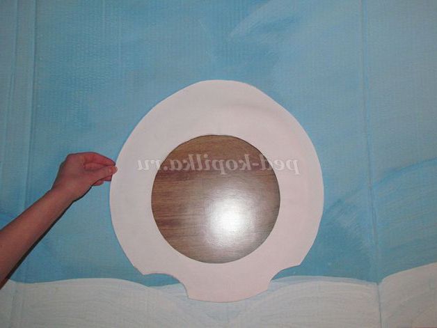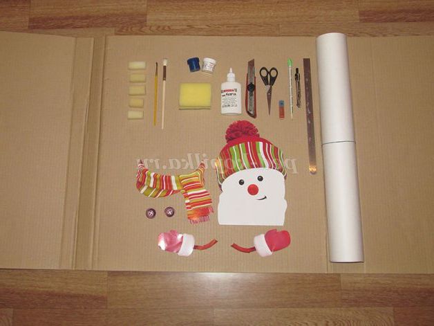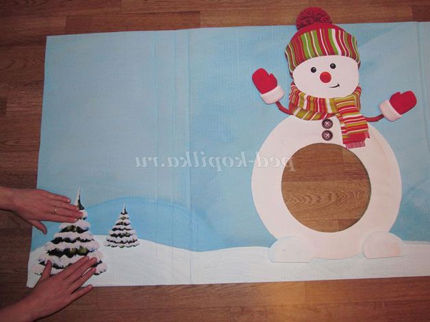 9. Поки поролон підсихає, прикладаємо сніговика до макету, щоб намітити місце для дірки. Прикладіть всі частини сніговика, щоб було видно, як це буде виглядати. Вирізати на макеті зручніше канцелярським ножем.