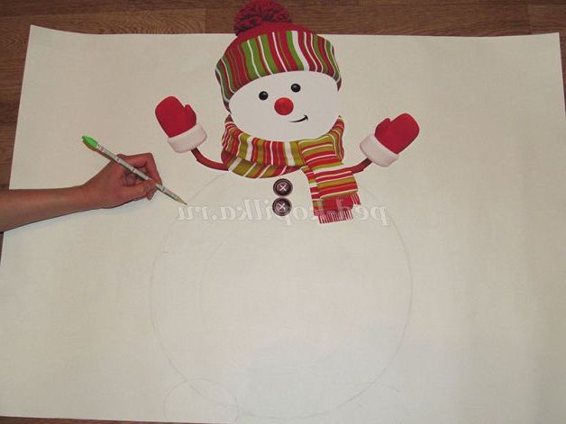 6. Розкладаємо вирізані частини сніговика на ватмані і домальовували тіло. В середині циркулем намалювати коло.