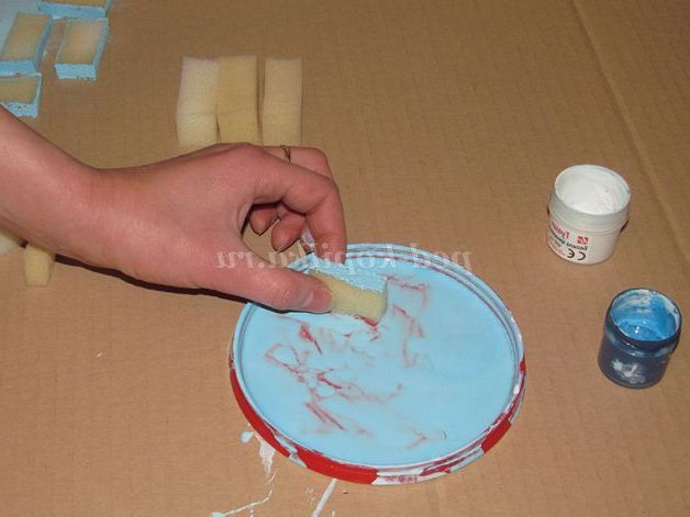 8. Поролон нарізаємо на маленькі брусочки. Брусочки для тіла сніговика повинні бути тонше інших. Для того, щоб поролон не виділявся на макеті, я просочила його боку блакитною фарбою, в тон з макетом.