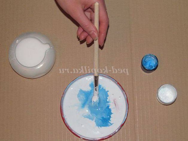 2. Готуємо фарбу для тонування картону. Для цього в тарілочці розводимо білу і синю фарби, додати побільше води.