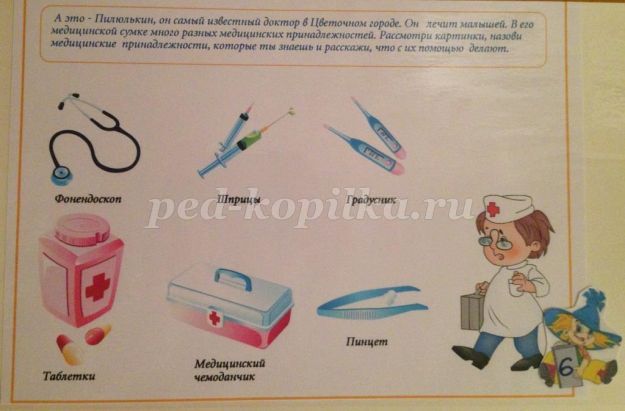 Опис : Дитині пропонується розглянути картинки назвати медичні інструменти які він знає і розповісти що з їх допомогою роблять. Якщо дитина не знайомий з деякими предметами, дорослий знайомить його з новими поняттями і пропонує дитині здогадатися, що роблять цими речами. Дорослий вводить поняття - медичні інструменти.