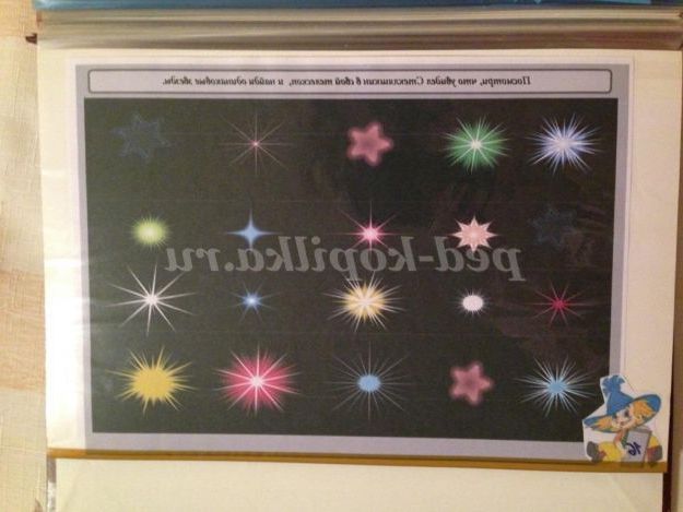 Опис: Дитині пропонується знайти однакові зірочки . Можна попросити дитину показати саму яскраву зірочку, найбільшу, маленьку, жовту, зелену, червону, зірочку з самими довгими променями, зірочку у якої найменше променів, зірочку у якої багато променів.