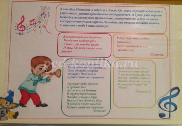 Опис: Дитині пропонується відгадати загадки, нижче наведені малюнки музичних інструментів, які є відгадками. Після виконання завдання, пояснюється, що це всі музичні інструменти. Можна запропонувати дитині назвати музичні інструменти, які він знає.