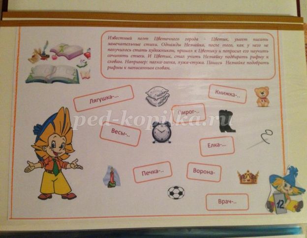 Опис: дитині пропонується підібрати рими до написаних слів. Поряд зі словами є картинки, які є відповідями на риму. При утрудненні дитини в підборі рим, можна звернути його увагу на картинки.