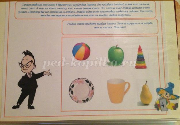Опис: Дорослий пропонує дитині виконати завдання Знайки. Можна після виконання завдання, запропонувати дитині так само загадати картинку, так само як це зробив Знайка, дорослому.