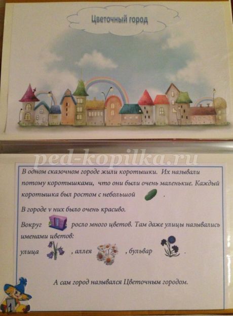 Опис: Дорослий читає дитині розповідь про мешканців Квіткового міста. Далі дитина повинна самостійно, після прочитання розповіді дорослого, знайти героїв за описом. Якщо дитина не може, дорослий зачитує опис кожного героя і після прочитання, пропонує дитині знайти персонажа про який прочитав.
