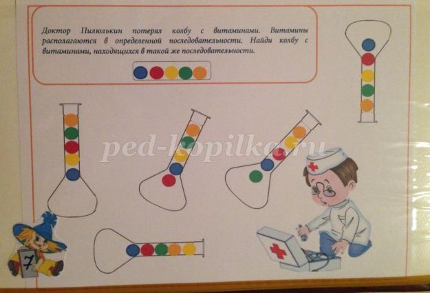 Опис: дитині пропонується виконати завдання Пилюлькина. Знайти колбу з вітамінками, де вітамінки розташовуються в певній послідовності.