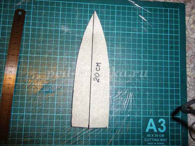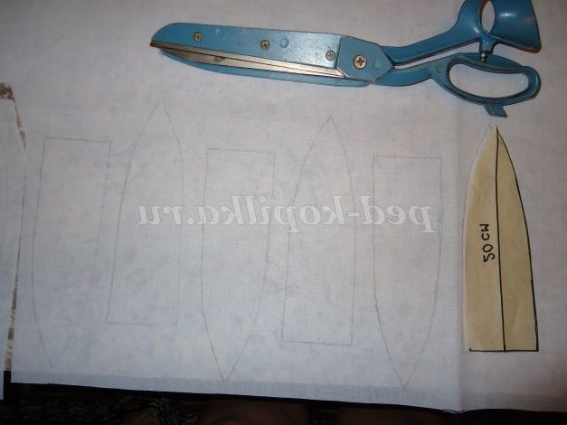9. Для другого ярусу ковпака малюємо пелюстки (ширина 6 см, висота 20 см). Вирізаємо з паперу 4 шт., прикріплюємо до масці з допомогою скотча