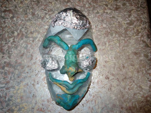 2. Для того, щоб створити ніс, губи, очі використовуємо фольгу (роблячи з неї кульки, овали, валики). Зверху покриваємо пластиліном і надаємо масці заключний вид.