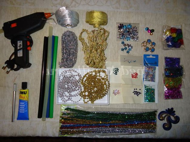 Для декорування Вашої маски, Ви можете використовувати будь-які матеріали, мені знадобилися: тасьма, стрази, тасьма з бус золотого кольору, бубонці, клей різних кольорів, клей для страз, макетний ніж.
