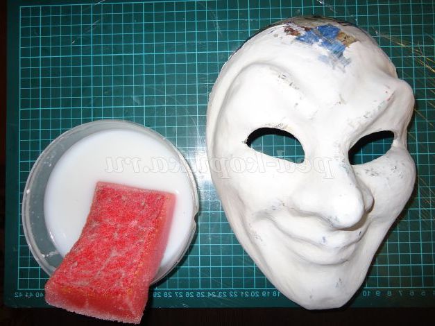 5. Після того, як пап'є-маше висохло, приступаємо до оштукатурювання маски. Гумовим шпателем наносимо штукатурку на маску. Поки штукатурка не засохла, розгладжуємо всі шорсткості за допомогою поролонової губки і води.