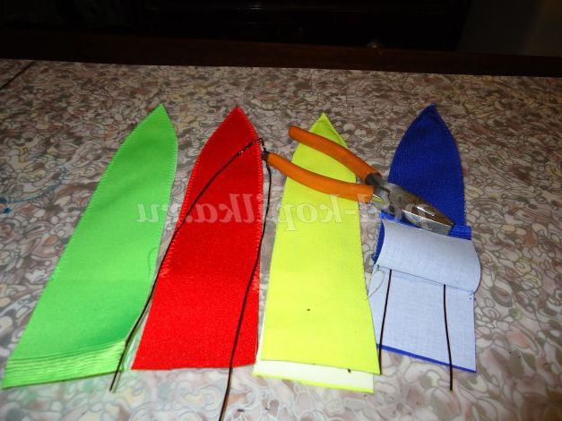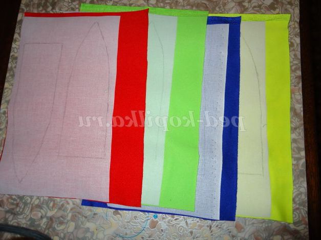 1. Шматочки трикотажу яскравих кольорів (в даному випадку салатовий, червоний, жовтий, синій)
