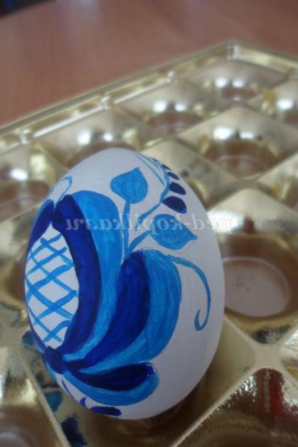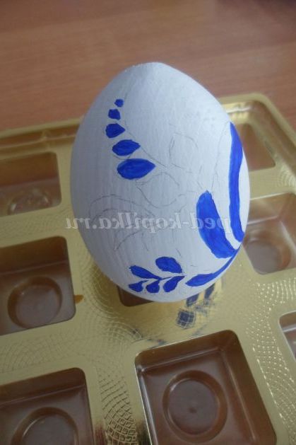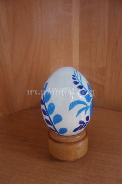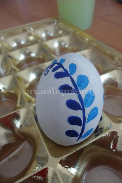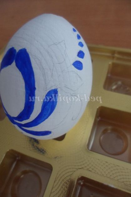 На білій формі яйця спочатку синьою фарбою, пензлем №2 пофарбуйте всі елементи візерунка,