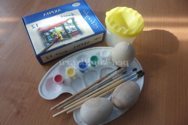 Дерев'яні форми яєць, акрилові фарби, пензлі №1, 2, 4, палітра, склянка для води, простий олівець, картинки із зразками візерунків, лак по дереву.