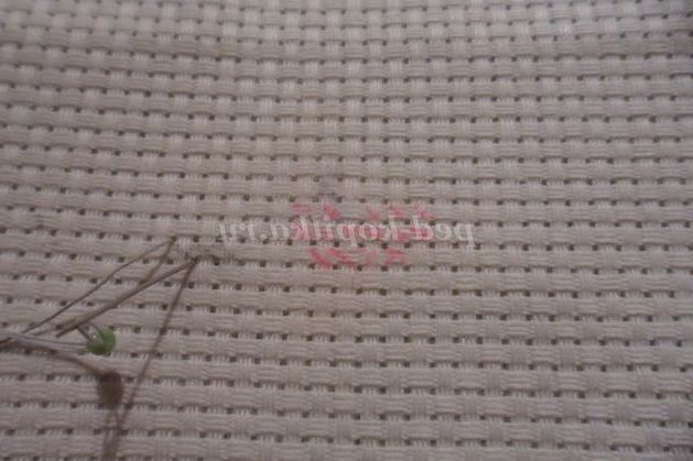 Підготовчий етап. Спочатку пришийте шматок білої тканини до канві, тоді бісер буде міцно триматися. Від правого нижнього кута відступимо вліво 4 см, а вгору 3,5 см, це буде початок роботи, можна нанести частина малюнка на канву, але тільки простим олівцем.