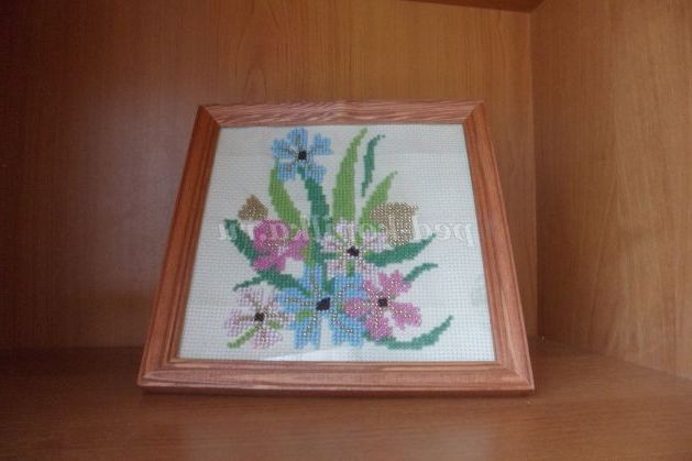 Заключний етап. Прибираємо нитки, якими була пришита тканину до канві, за допомогою двостороннього скотча прикріплюємо готову роботу на основі і вставляємо в саму рамку, подарунок готовий.
