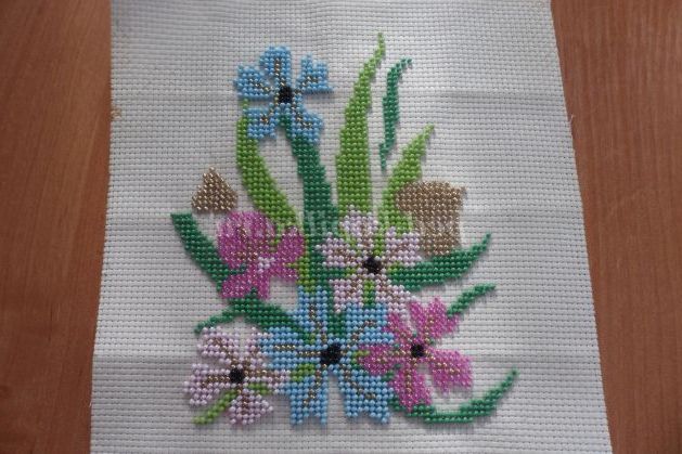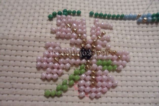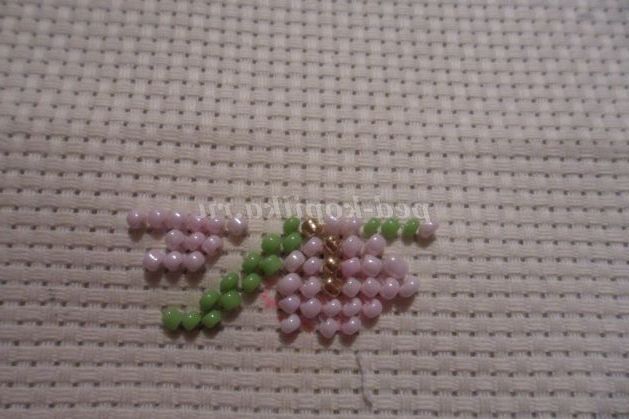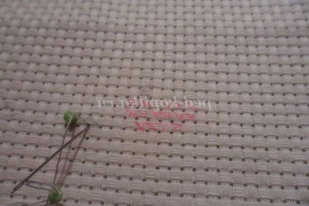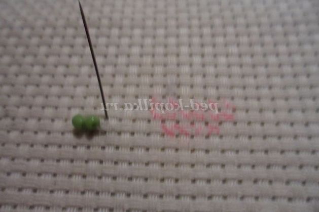 З виворітного боку вставити голку в правий верхній кут, простягніть нитку, надіньте іншу бісерину і протягніть голку з ниткою в лівий нижній кут.