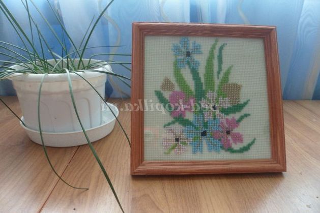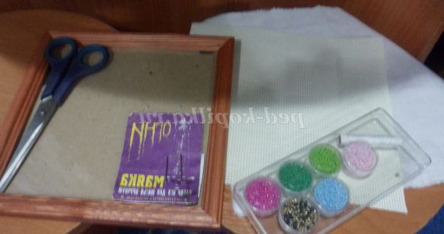 Матеріал: Бежева канва для вишивки 20 на 20 см, шматок білої тканини 20 на 20 см, кольоровий бісер, ножиці, голка, тонкі, але міцні нитки, двосторонній скотч, схема вишивки, фоторамка 20 на 20.