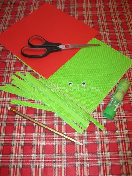 на картоні відміряємо лінійкою мітки по 1 сантиметру і малюємо смужки, потім нарізаємо акуратно ножицями (смужки нарізаємо заздалегідь, можна кілька смужок дати нарізати самим дітям. З жовтого гофрованого картону вирізаємо пелюстки для квіточки.