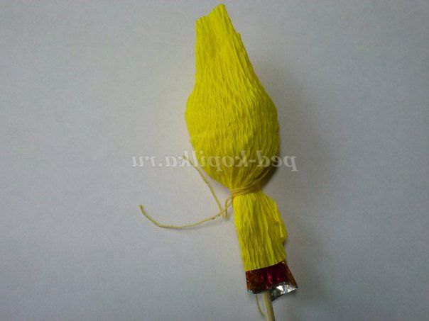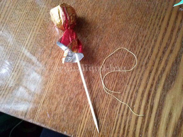 6) Тепер виготовимо основу для троянд. До шпажкам за допомогою нитки прикріплюємо цукерки.
