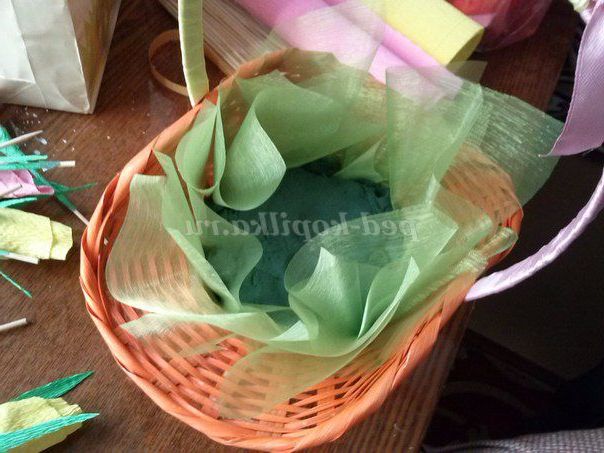 9) Оформляємо нашу кошик. Укладаємо на дно флористичну губку (або пінопласт).