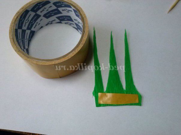 8) Відрізаємо зеленої смужки паперу 30 на 5 см, приклеюємо їх на двосторонній скотч: