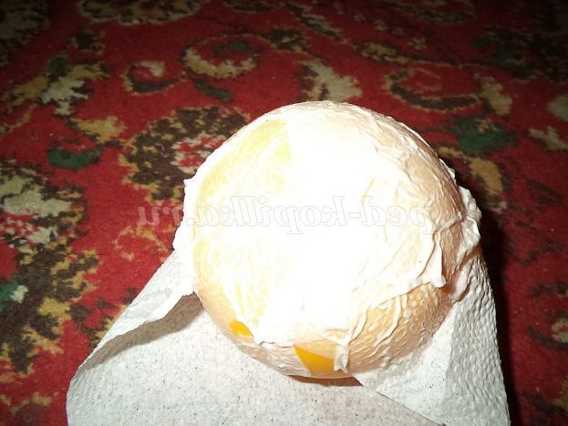 2. Беремо кулю, загортаємо в білу,паперову серветку, починаємо просочувати його розведеним клеєм - робимо три, чотири шари. Просушуємо на батареї годину, півтора;