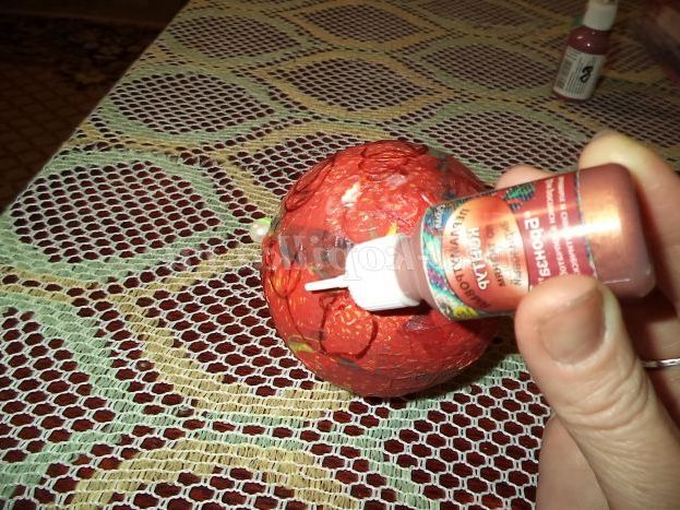 6. Залишилося зовсім небагато. Робимо отвори в нашому кулі за допомогою розпеченого цвяха, але можна, і просвердлити дрилем. Вставляємо стрічку або нитку декоративну. Покриваємо виріб акриловим лаком, сушимо в підвішеному стані.