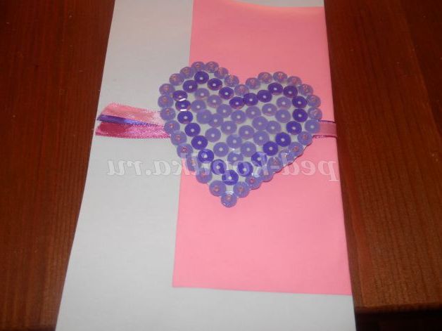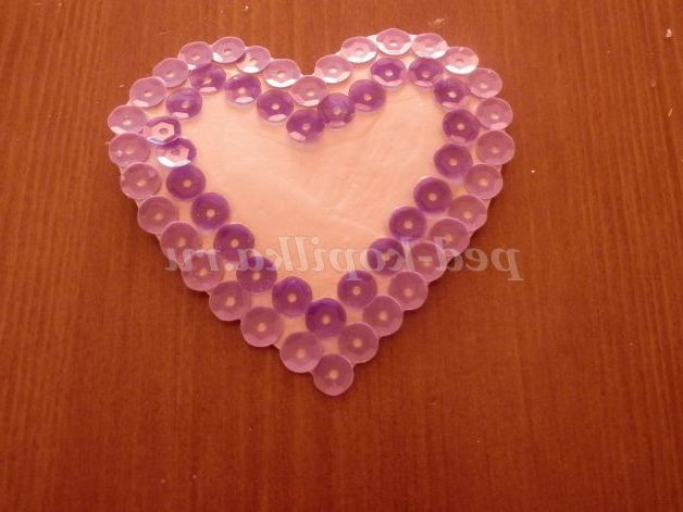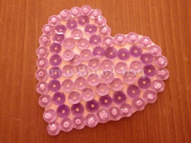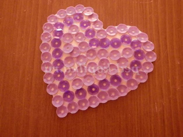6.Начинаем приклеювати паєтки на наше сердце.1-й ряд світло-бузкові паєтки,2-й ряд темно фіолетові паєтки,3-й ряд світло-бузкові паєтки.