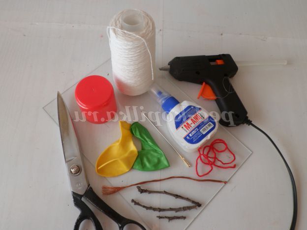 Для виготовлення сніговика нам знадобиться:білі Нитки, клей ПВА, товста голка,повітряні кульки, ножиці, невеликий шматочок вовняних ниток червоного кольору,кришка від флакона аерозолю,гілочки дерева, багатодротова тонка дріт, гарячий клей,скло від рамки