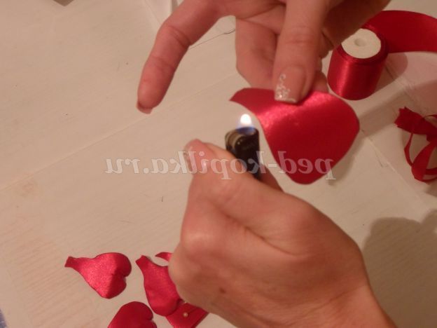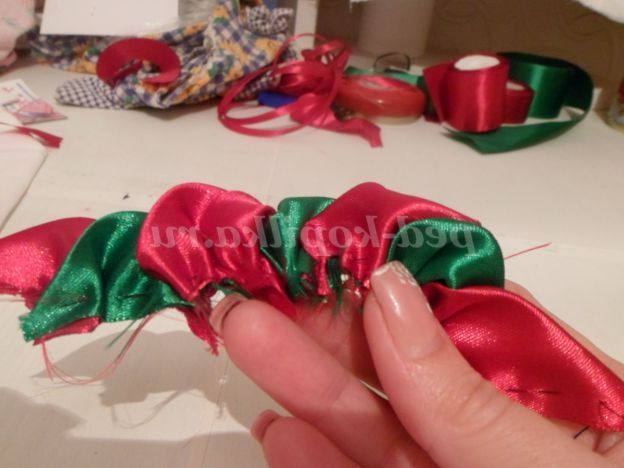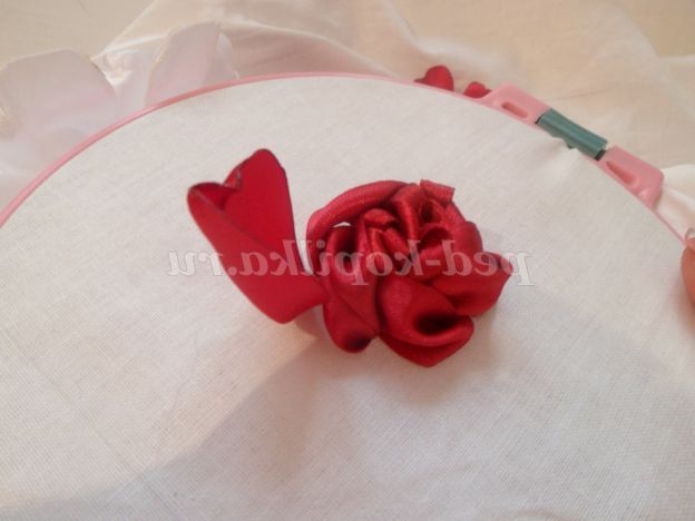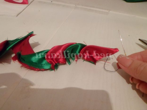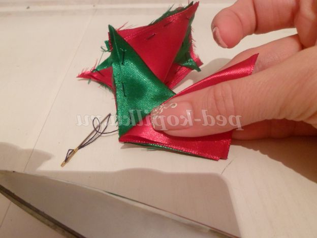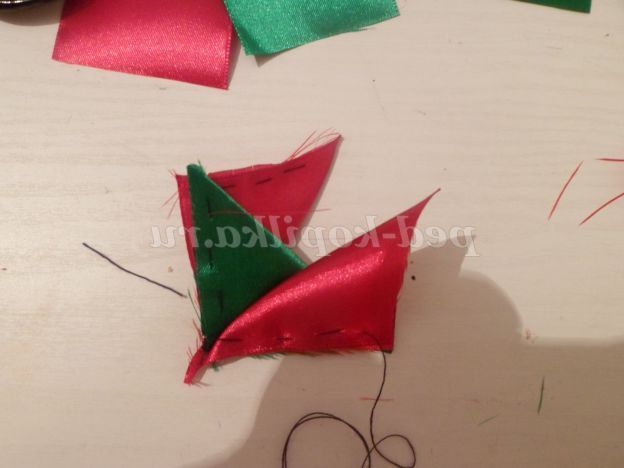 На цьому можна б і закінчити, але я пропоную додати до нашого бутон квітки. Для цього потрібно зі стрічки 5 див.,Вирізати 8 квадратів. Складаємо квадрати по діагоналі, повертаємо вийшов трикутник прямим кутом до себе. Беремо голку з ниткою і починаємо крайню сторону на голку маленькими стібками. Доходимо до прямого кута, до незібраною стороні прикладаємо наступний трикутник і продовжуємо збирати. Таким чином, ми збираємо на одну нитку всі наші квадрати.