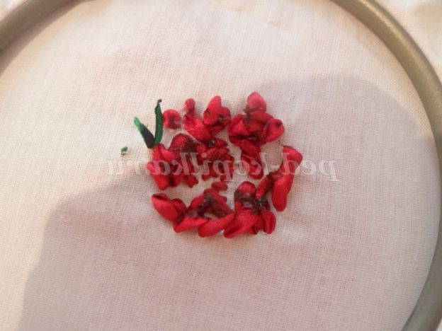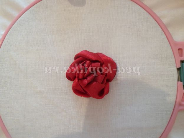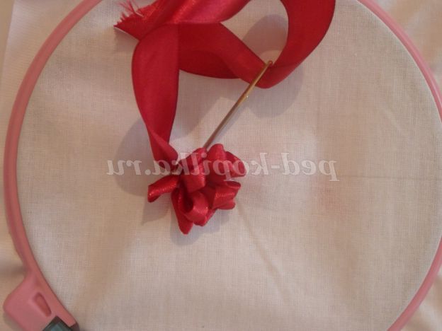 На основі малюємо серединку квітки. заправляємо стрічку 0,5 див. в голку. Починаємо роботу з виворітного боку, виводимо голку на лицьову витягуємо стрічку,слідкуємо щоб кінець стрічки з вивороту нікуди не втік. Вколюємо голку на лицьовій стороні поруч з виходом стрічки. Протягуємо стрічку на виворітну сторону залишаючи петлю близько 1 див. Таким чином заповнюємо всю серединку квітки.