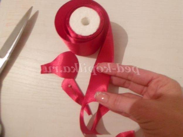 Вирізаємо заготовку пелюсток. Для цього згинаємо широку стрічку вздовж і вирізаємо половину "грибочки"