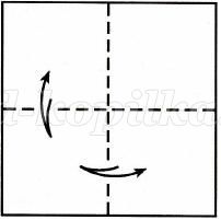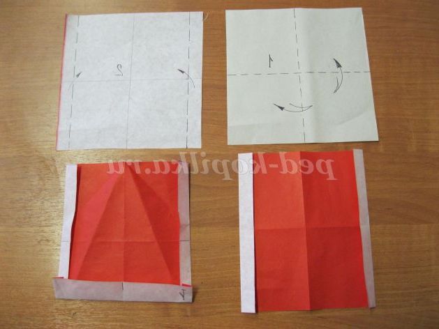 1. Беремо квадрат зі стороною 18 на 18 см, кладемо кольоровий стороною до себе і перегинаємо двічі навпіл, при цьому поєднуємо протилежні сторони.