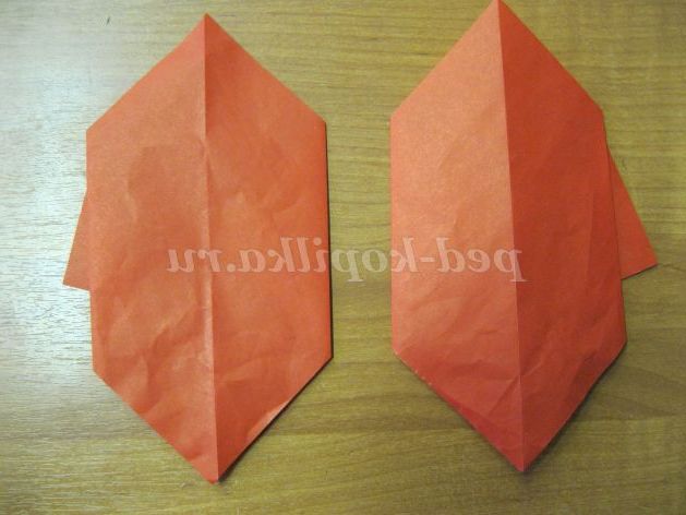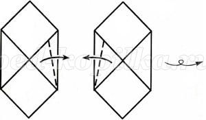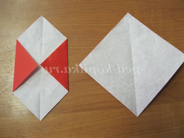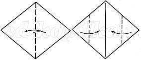 1. Беремо 2 квадрата 2х2 см і перегинаємо по діагоналі. Бічні кути квадратів складаємо до центру заготовки.