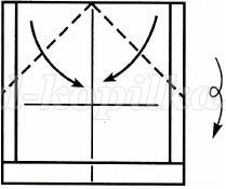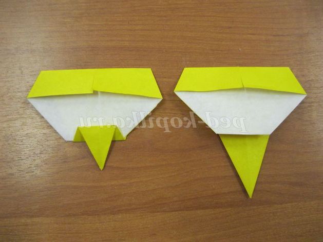 1. Беремо квадрат 9х9 див. з жовтого паперу. Складаємо базову форму повітряний змій. Згинаємо верхні сторони до центральної вертикалі