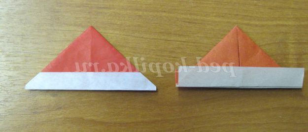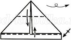 2. Підняти нижні сторони, верхній кут опустіть вниз, прибираючи під білу смужку, і переверніть шапочку на іншу сторону.