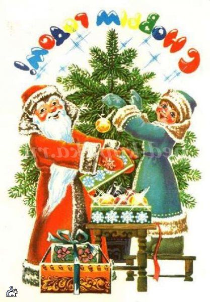 Часто на новорічних листівках зображували Діда Мороза зі Снігуронькою біля ялинки.