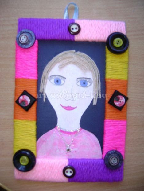 Оформлення зачіски: приклеюємо клеєм ПВА пряжу на голову /колір пряжі збігається з кольором маминих волосся/.