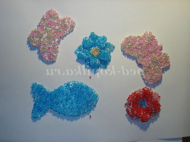 Вихователь: Давайте розглянемо, яку рибку і квітка можна зробити з бісеру (показ зразків). Як вони зроблені? Короткий розповідь про етапи роботи над виробами з демонстрацією трафаретів.