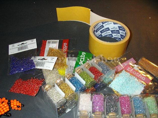 Для роботи нам знадобляться наступні матеріали: бісер різних кольорів, скотч (двосторонній), ножиці, паперові викрійки.