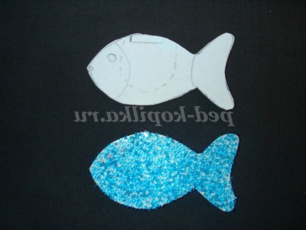 Спочатку діти обводять трафарети, потім вирізаємо з дітьми паперові викрійки для елементів плаката - рибки, квіти.