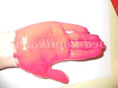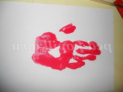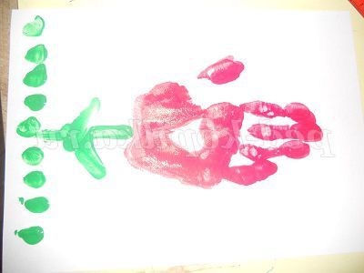 Діти сідають за столи. Хлопці а якого кольору у Неї квітка. Червоного. Хлопці опускають свої долоньки в тарілку і червоної пальчикової фарбою, потім роблять відбиток на аркуші, у верхній частині аркуша.