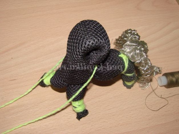 Далі проводимо вуздечку між передніми ногами коники, формуючи вигин шиї-голови. А ниткою, розсунувши її, обмотаємо передні ніжки під грудкою. Зав'язати нитка на спинці під гривою